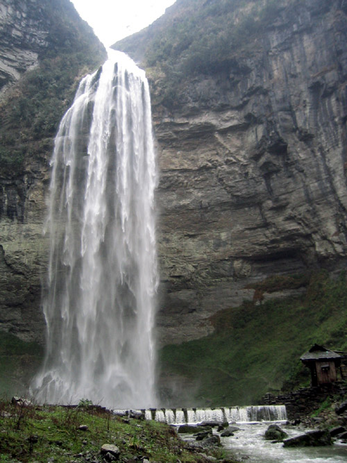 從正面仰望瀑布,好像瀑布是從云端飛流直下,可謂“飛流直下三千尺,疑是銀河落九天。”沿潭畔走至瀑布里去,象是猴王鉆進了水簾洞。從瀑布背后觀瀑布,只看見瀑布是從一個半園形的“月亮巖”上飛瀉下來的。