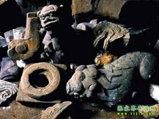 土司古墓群多集中于司城紫金山、雅草坪、帕桶湖三個地方,其中以紫金山最多。據(jù)勘察,紫金山一處共有土司王及其貴族墳墓109座。彭福石沖以后的土司、土官及其眷屬,都分別埋葬在這里。古墓的規(guī)模大小,視其官爵而定。從已挖開的30多座古墓來看,基本形式是用土磚拱成半圓形,墓前有石人石馬,四周筑有圍墻,進出必經鐵門。墓室四壁上刻有精美的花草圖案和龍鳳圖案。棺材系楠木、梓木做成,用土漆漆成烏黑色,并用鐵鉤懸掛在石室之內。隨葬器物也極為豐富,有金花、金譬、發(fā)插、耳環(huán)、蓮蓬等金銀飾物,還有各種玉器等。明代一些名土司彭顯英、彭冀南等人的墳墓至今尚保存完好。古墓群現(xiàn)為湖南省重點文物保護單位。