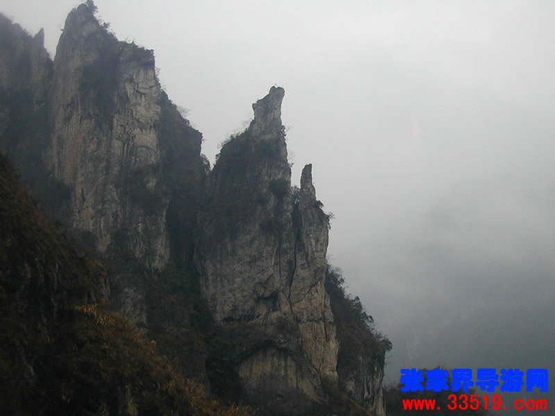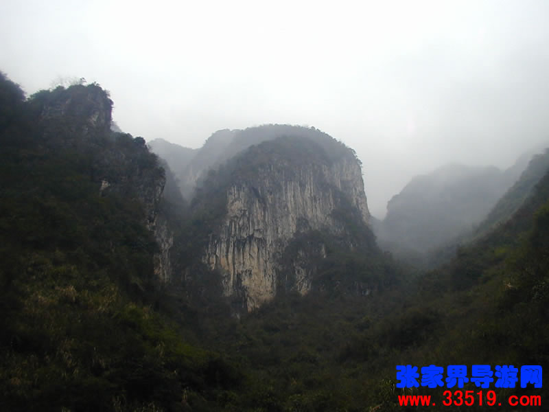 南天門——沿著河水一直往里走,在溪水最深處,可以仰望那隱藏在云霧里的南天門。它并不同于天門山的天門洞。它獨(dú)立于眾山之中,就像真正的通天大門,當(dāng)你翻過了前面的天門洞,卻還要再通過這座南天門,方可真正羽化登仙。南天門旁邊的幾座山峰,也都生的奇形怪狀,倒也天然形成了一個個大大小小的自然景觀。宛如天兵天將般守衛(wèi)南天門的將軍巖,象征南天門仙家氣息的蠟燭峰等,散落在四周,構(gòu)成了一個整體的山體奇觀。