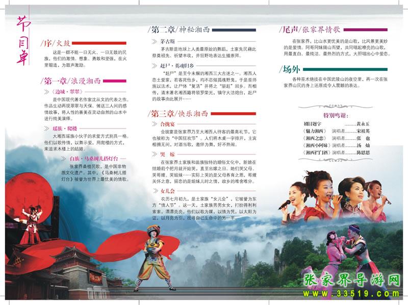 為將最好的張家界和大湘西的魅力呈現(xiàn)于世,“張家界·魅力湘西”的創(chuàng)作團(tuán)隊(duì),數(shù)年來走遍了張家界和大湘西地區(qū)近百個(gè)原始村寨,采風(fēng)、記錄、整理出湘西民族、民間、民俗文化形態(tài)和素材。10年來,“張家界·魅力湘西”成功將一大批民間藝人請出山寨、請上舞臺,使諸多隱匿深山、瀕臨失傳的張家界和大湘西“三民”文化活化石展現(xiàn)在舞臺上。