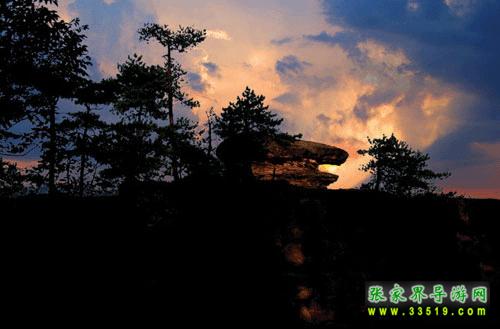 從黃石寨頂西邊下山時(shí),后卡門邊一頂部呈平展臺(tái)面的石峰上,一只長約5米的石龜頭部向前,作爬行狀。晴天,龜巖呈金黃色,故稱金龜。氣候的變化又可使其呈現(xiàn)各種不同顏色和形狀,故它又有“霧海金龜”、“金龜探海”、“落日金龜”等幾個(gè)別名。
