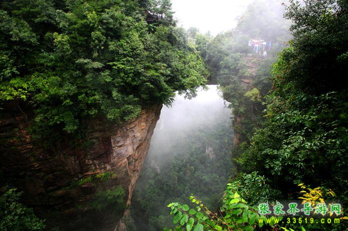 醉月臺(tái)西去兩百余米,有一座50多米長(zhǎng),15米厚的條石搭在兩座山峰之間,其下嵌空350多米,這就是名聲赫赫的天下第一橋。橋約20米長(zhǎng),最薄處約4米厚,最窄處只有2米多寬。與兩邊橋墩合為一體,天衣無縫。橋面兩側(cè)、橋頭兩壁上端均有綠樹簇?fù)?,郁郁蔥蔥,而橋下洞壁宛若刀削,草木不生。望橋臺(tái)有三處,其一在橋邊20米處,俯視橋面,但見兩側(cè)綠叢中間,一段平路通向彼峰,橋洞依稀,下端被密林遮住,往來其間,無甚驚險(xiǎn)。其二在橋左側(cè)30多米處的石壁上,透過樹枝向右下俯視,可見橋洞側(cè)面一部分,不知其下幽深幾許,若逢雨后初晴,有云霧在眼前突涌,亦不明其由來。最扣人心弦的是繞過右邊長(zhǎng)達(dá)1200多米的“U”形深谷,隔200余米的澗谷向東觀賞,橋面橋洞,橋壁橋底,一覽無余。它造型巍峨,偉岸雄奇,高峻深險(xiǎn),形神逼真,確屬大自然神工鬼斧之杰作。