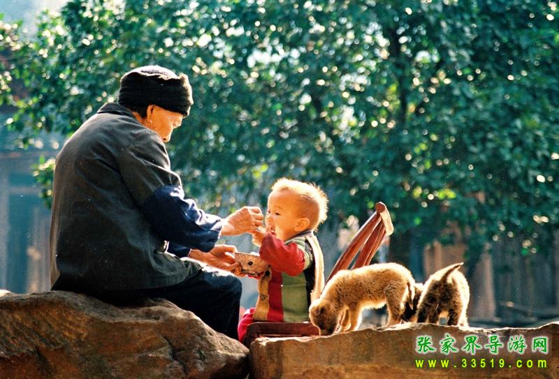 孩子們自從娘胎里出來(lái),父母?jìng)兙徒o備好了一首首童謠。在襁褓中時(shí),有簡(jiǎn)短的搖籃曲。“我的小寶貝,睡吧快快睡,你莫哭,快長(zhǎng)大,我的小寶貝”,伴以“喲嗯”之類的喉音和鼻音。哭鬧的孩子在這低低的吟哦中,在這輕柔的春風(fēng)中,會(huì)緩緩的走入夢(mèng)鄉(xiāng)。到孩子牙牙學(xué)語(yǔ)時(shí),就會(huì)換上新的內(nèi)容。為讓孩子從小懂得廉恥,大人會(huì)教孩子《蟲(chóng)蟲(chóng)兒飛》:“打板板,逗蟲(chóng)蟲(chóng)兒,蟲(chóng)蟲(chóng)兒飛,飛到嘎兒(外公)去。嘎兒不趕狗,咬到蟲(chóng)蟲(chóng)兒的手;嘎兒不殺雞,蟲(chóng)蟲(chóng)兒不回去;嘎兒不打蛋,蟲(chóng)蟲(chóng)兒不吃飯;嘎兒不殺鵝,蟲(chóng)蟲(chóng)兒不過(guò)河。”(土家把孩子名字叫得賤,喊成“蟲(chóng)蟲(chóng)兒”)。在唱的同時(shí)手把手地教孩子做蟲(chóng)蟲(chóng)飛的動(dòng)作。唱完后,又會(huì)用手指點(diǎn)點(diǎn)孩子的左右臉,刮一下孩子的鼻子,“這兒也丑,那兒也丑,鼻子刮豬油。”意思是好吃是丟臉的,蟲(chóng)蟲(chóng)兒可不能這樣。勤勞是做人的根本,也是土家人的傳統(tǒng)美德,“三歲看大,八歲看老”,大人會(huì)教些勤勞的童謠?!顿u(mài)豆腐》道:“一顆豆子圓又圓,推成豆腐賣(mài)成錢(qián),別人講我生意小,小小生意賺大錢(qián)。”為讓孩子自小懂得親疏,教孩子《推磨》:“推磨拐磨,推的粑粑白不過(guò)。推粑粑,接嘎嘎,嘎嘎不吃娃娃的酸粑粑;推豆腐,接舅舅,舅舅不吃娃娃的酸豆腐;推合渣,接姨媽,姨媽不吃娃娃的酸合渣……”夏日的夜晚,一家人出來(lái)在月亮地里歇涼,有夜火蟲(chóng)(螢火蟲(chóng))舉著火把飛來(lái),母親會(huì)以夜火蟲(chóng)打頭,以“一問(wèn)一答”的聯(lián)句方式,考考孩子的記憶力:“夜火蟲(chóng),夜夜來(lái),嘎婆接你吃茶來(lái)。什么茶?豆茶。什么豆?黃豆。什么黃?朱砂黃……”