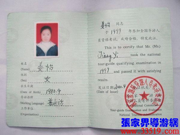 | 姜怡,女,導(dǎo)游員資格證書編號(hào):Hun990125。 大專學(xué)歷,自99年9月森林保護(hù)節(jié)前開始從事導(dǎo)游工作,同年十二月參加全國(guó)導(dǎo)游員資格考試,并以優(yōu)異成績(jī)?nèi)〉谩皣?guó)導(dǎo)證”,現(xiàn)為張家界華天國(guó)旅旅行社的專職導(dǎo)游員。整個(gè)帶團(tuán)期間,無論團(tuán)隊(duì)或散客,未出現(xiàn)一次旅游事故或游客投訴事件,普遍反映帶團(tuán)效果好。 | 導(dǎo)游自述