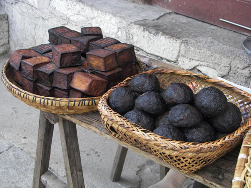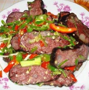 介紹: 血豆腐,就是將豆腐和豬血、豬肉及花椒、辣椒等佐料拌成泥狀,捋成卵形,以竹篩置火炕上,煙熏烤成臘黃,吃起來耐嚼味香,是土家特色菜,當?shù)厝顺R云湎戮啤?在張家界的飯館里很難吃到正宗的土家特色菜,可以去做土味的特色餐館去解解饞。但是最正宗還是鄉(xiāng)下人家家里自己熏的,那才叫一個好吃!??!