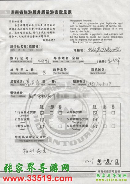 2009年6月18日高先生一行8人接待質(zhì)量反饋單: