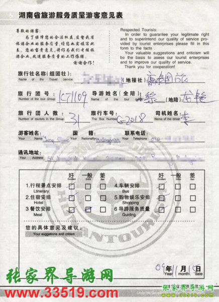 2009年11月9日馬來西亞yeap先生一行31人旅游接待質量反饋單: