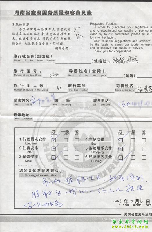 2009年7月4日鐘先生一行6人接待質量反饋單: