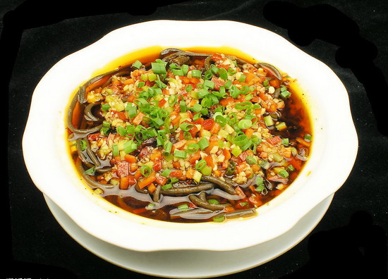 “蕨根粉”的樣子看上去就是黑色的粉絲,它是從野生蕨菜的根里提煉出來的淀粉類做成的粉絲食品。因?yàn)檗Р说母亲仙模宰龀龅姆劢z也就成了“黑粉絲”。蕨根粉保留了蕨菜根里大部分營養(yǎng)(涼粉、粉絲營養(yǎng)與原料比損失的多且豆粉的不易消化),而“蕨根”對人體的保健作用是根莖類食物里名列前茅的,這也是符合顏色越深的,營養(yǎng)越高規(guī)律的又一個例子。